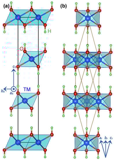 (a) The conventional cell of layered double hydroxide compounds in hexagonal representation with group and space group number 166. (b) The rhombohedral representation of the same structure used for most calculations. In hexagonal representation, , , and . In the rhombohedral presentation, the lattice parameters and . The rhombohedral lattice parameters (denoted with subscript r) are related to hexagonal lattice parameters (denoted with subscript h) according to , and .