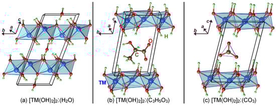 A representative of the LDH compounds intercalated with (a) , (b) , and (c) . The optimised structures had higher cantered monoclinic symmetry with group (group number 5) for the water intercalated compounds. The rest of the structures were .