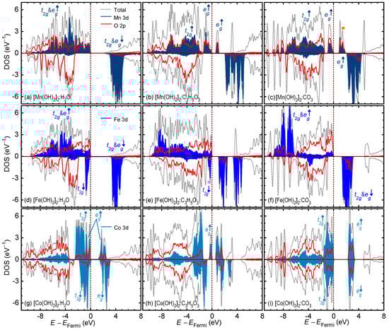 Total and partial density of state of the intercalated layered double hydroxide compounds. The upper row of (a–c) corresponds to the Mn-based compounds. The middle row of (d–f) corresponds to the Fe-based compounds. The lower row of (g–i) corresponds to the Co-based compounds. The first, second, and third columns correspond to , , and intercalation. The 3d partial density of states of different TM ions is shown in various shades of blue.