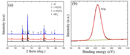 The XRD patterns in Figure 2a showed the presence of γ-Al2O3, α-Al2O3, and AlF3 in all the samples, regardless of SCi concentration. The formation of γ-Al2O3 and α-Al2O3 is related to the reaction between Al3+ cations (from the substrate) and O2− anions (from the electrolyte) under fast and slow cooling rates, respectively. On the other hand, the formation of AlF3 can be attributed to the hydrolysis of SiF62− anions, as shown in Equation (1) [15].
