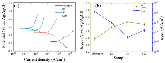 (a) PDP curves of the bare substrate and the S0, S5, and S10 samples in a 3.5 wt.% NaCl solution. (b) Change of Ecorr and icorr as a function of the SCi concentration.