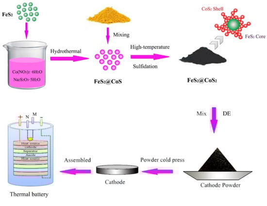 As a semiconductor, transition sulfides possess good conductive properties and are relatively ideal cathode materials for thermal batteries [8,9]. Among them, natural pyrite FeS2, with its high discharge voltage (about 2.1 V), high theoretical capacity (1206 As/g), stable performance, and low price, is a mature cathode material for industrial applications [9]. However, FeS2 will violently decompose into Fe7S8 and S2 at 550 °C, resulting in low output capacity [6,10]. Additionally, the decomposed sulfur vapor produces a severe thermal effect with the anode and other substances in the batteries, and short-circuit combustion can occur in serious cases. By comparison, the synthetic pyrite type CoS2 cathode material, with high thermal stability (decomposition temperature of about 650 °C) [11,12,13], high conductivity, and low polarization under a high current density, is considered an ideal alternative to FeS2. CoS2 material has many defects, such as a relatively low discharge voltage (about 2.0 V) and theoretical capacity (1045 As/g), artificial synthesis, and a high price [8]. Hence, the development of cathode materials with a low cost and specific characteristics for thermal batteries has attracted extensive interest among scholars [14,15]. As a cathode material, NiCl2 has a high power density [4,16,17,18], but easily dissolves in halogen salt electrolyte, leading to a short working time and slow activation speed [19,20]. The performance of the CoS2 surface is improved by C coating, but this requires a complex production process [12,21]. The new cathode (MnO2, Cu2O) can only be applied at a low current density and does not tolerate a high current environment [22,23].