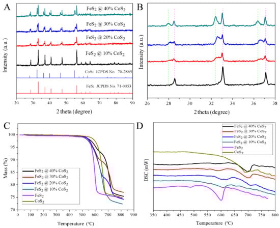 (A,B) XRD patterns, (C) TG and (D) DSC curves of FeS2@CoS2 samples.