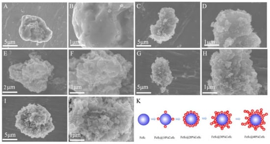 The SEM images of (A,B) FeS2, (C,D) FeS2@10%CoS2, (E,F) FeS2@20%CoS2, (G,H) FeS2@30%CoS2, and (I,J) FeS2@40%CoS2. (K) Morphology schematic of the FeS2@CoS2 samples.