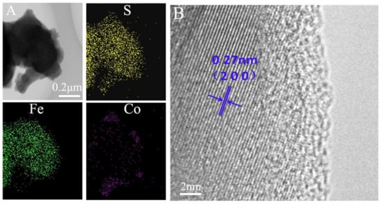(A) Element mappings, (B) HRTEM image of FeS2@40%CoS2.