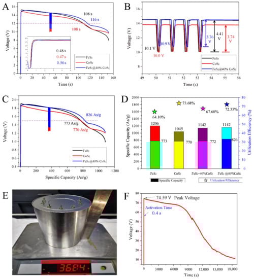 (A) The discharge curves of FeS2, CoS2, and FeS2@40%CoS2. (B) The corresponding changes of the discharge voltage with a pulse current of 5 A/cm2. (C) The relationship between voltage and specific capacity of FeS2, CoS2, and FeS2@40%CoS2 at 1 A/cm2. (D) The specific capacity and utilization efficiency of FeS2, CoS2, FeS2 + 40%CoS2, and FeS2@40%CoS2. (E) Thermal battery sample. (F) Safety test curve under a no-load test.