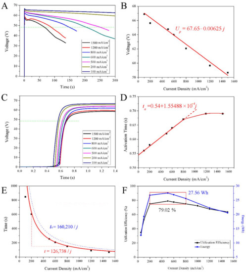 As seen in Figure 6D, the activation time of the batteries has a linear relationship with the current density in the early stage, and gradually tends towards constant in the later stage. The linear relationship can be fitted as ta = 0.54 + 1.55488 × 10−4j, and the activation time ta of the batteries is 0.54 s without load (j = 0 mA/cm2). According to U∝−j e(Eκ/RT), under the premise of a loading large current, e(Eκ/RT) is a constant value at the same time, and the open circuit voltage is linear with the current density j. As the current density j increases, the open circuit voltage is negatively correlated, so the time for the voltage to reach the active voltage is delayed. When the time is long enough, the molten salt completes the phase transformation and starts to heat up rapidly. Even if the current density increases, the activation time will not be affected, and the activation gradually tends towards becoming stable.