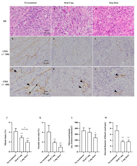 The subcutaneous tumors in the no treatment, oral, and 1 mg sheet groups were examined histologically 14 days after the start of treatment. Tumor sections stained with H&E in each group (Figure 4A–C; 400×), representative images of vessel walls stained with CD31 (Figure 4D–F; 200×), and cross-sections of the vessels (4G–I; 400×) are shown. Tumor angiogenesis was assessed by measuring the area of CD31-positive areas per unit area (vessel area ratio), MVD (number of microvessels/mm2), and diameter of blood vessels (μm) after staining with anti-CD31 antibody. The proliferative potential of the cells was assessed using MI (%) (Table 3). The proliferative potential was inhibited in the oral (2.88 ± 0.36%; p < 0.01) and 1 mg sheet (1.96 ± 0.36%; p < 0.01) groups compared with that in the no treatment (4.14 ± 0.63%) group. Furthermore, the proliferative capacity of the 1 mg sheet group was more inhibited than that of the 3 mg oral group (Figure 4J). The vascular area ratio was reduced in the oral (1.92 ± 0.26%; p < 0.01) and 1 mg sheet (0.97 ± 0.43%; p < 0.01) groups compared with that in the no treatment (4.10 ± 1.34%) group (Figure 4K). Furthermore, MVD was significantly reduced in the 1 mg sheet (243 ± 52/mm2; p < 0.05) group compared with that in the no treatment (362 ± 48/mm2) group, despite the lower drug amount than that in the oral (336 ± 68/mm2) group (Figure 4L). The mean diameter of the vessels was also significantly smaller in the oral (3.53 ± 0.47 μm; p < 0.01) and 1 mg sheet (3.52 ± 0.60 μm; p < 0.01) groups than that in the no treatment (7.29 ± 1.64 μm) group (Figure 4M).