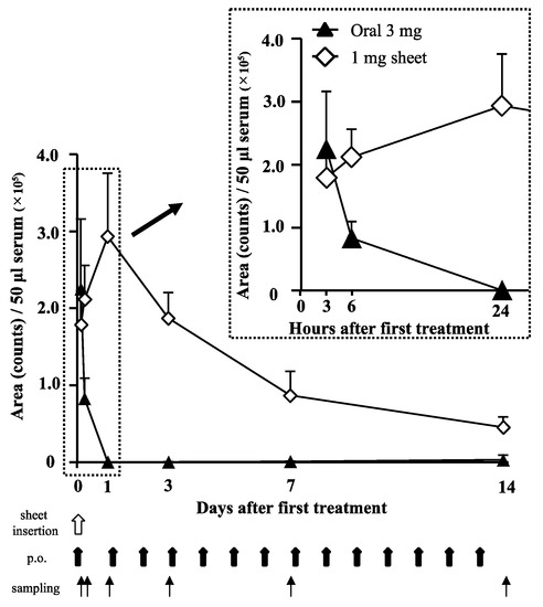 Trends of serum lenvatinib levels. The serum lenvatinib levels in the oral (filled triangle; 3 h: n = 5, 6 h: n = 5, day 1: n = 5, day 3: n = 5, day 7: n = 10, and day 14: n = 10) and 1 mg sheet (open diamond shape; 3 h: n = 5, 6 h: n = 5, day 1: n = 5, day 3: n = 5, day 7: n = 10, and day 14: n = 10) groups were analyzed using LC-MS/MS (at least five mice in each group were tested at each time). Blood sampling was attempted at 3, 6, and 24 h and 3, 7, and 14 days after sheet insertion or the first oral administration. The report of the animal experiment in the developed pharmaceutical company is described below (https://www.pmda.go.jp/drugs/2015/P201500005/170033000_22700AMX00640_I100_1.pdf, accessed January 6, 2022). The time to reach the maximum level of lenvatinib in mice was 0.5–1 h, and the elimination half-life in the blood was 1.74–2.09 h; the original peak was much higher.