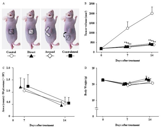 Antitumor effect of lenvatinib sheets in the different insertion positions. The mice were categorized into four groups according to the treatment method: the control (open circle; day 0: n = 11, day 7: n = 6, and day 14: n = 11), direct (filled triangle; day 0: n = 10, day 7: n = 5, and day 14: n = 10), peripheral (open diamond shape; day 0: n = 10, day 7: n = 5, and day 14: n = 10), and contralateral (filled square; day 0: n = 10, day 7: n = 5, and day 14: n = 10) groups. (A) Schematic diagram of the mice. (B) Time course of xenograft tumor volume. (C) Trends of serum lenvatinib level. (D) Body weight in each group. Data are presented as means ± standard deviations. ** p < 0.01 compared with the control group. The results are the sum of two independent experiments.