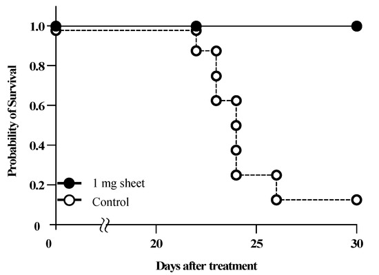 The overall survival was significantly prolonged in the 1 mg sheet group compared with that in the control group (p < 0.01) (Figure 7). In the control group, gross peritoneal tumor nodules became visible on day 14 after treatment, and six of eight mice (75%) exhibited bloody ascites on day 20. On day 30 after treatment, seven of eight mice (87.5%) died. In contrast, all mice in the 1 mg sheet group remained alive 30 days after treatment, and none of them exhibited peritoneal disseminated nodules or ascites.
