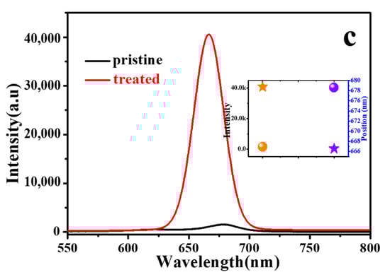 Figure 1a shows the schematic of the process of mild O2 plasma treatment of the MoS2 device, and the image of the device is shown in the inset of Figure 1b. In order to ensure a better light absorption, the thickness of MoS2 was selected as 9.8 nm (shown in Figure S1), and the corresponding bandgap is 1.3 eV. Meanwhile, in order to ensure the timeliness of the treatment effect, plasma treatment was carried out after the device was completed, and the treatment conditions were 30 W, 50 Pa and 30 s. The Raman spectra before and after plasma treatment are plotted in Figure 1b, the observed typical peaks at 383 cm−1 and 408 cm−1 can be attributed to the in-plane E12g phonon mode and the out-of-plane A1g mode []. Through the fitting analysis of peak position and intensity, it can be found that compared with the pristine sample, the E12g peak of the treated sample was decreased and slightly broadened. At the same time, the A1g peak also undergoes a slight blue shift. The variation of the Raman spectrum indicated that p-type doping of the MoS2 sample occurs during the oxygen plasma treatment process []. Of course, the photoluminescence (PL) intensity is more sensitive to doping effects. As shown in Figure 1c, the PL intensity of the MoS2 flake can be strongly enhanced by 30 times after the oxygen plasma treatment, along with a ~12 nm blue shift. The as-prepared few layer MoS2 is normally n-doped, due to the presence of sulfur vacancies (SVs) on the surface in intrinsic MoS2, which will act as electron donors and induce localized states in the bandgap []. In such a case, the photoexcited electron-hole pairs will combine with the excess electrons to form negative trions, resulting in fluorescence peaks located at smaller energies. After the oxygen plasma exposure, on one hand, the adsorption of O2 molecules or atoms will consume the excess electrons, thus switching the PL process from trion recombination to exciton recombination. On the other hand, the dangling bond density on the surface will be reduced, which was mainly caused by deep level trap states in bandgap formed by defects, and thus the radiative recombination rate increases considerably, resulting in a dramatic increase in PL.