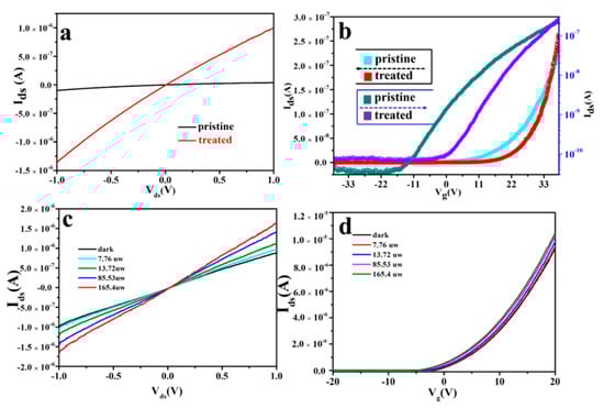 Figure 2c shows the output characteristics of the device after plasma treatment under laser illumination with 532 nm. The transistor channel length was smaller than the area of the laser spot, confining the laser irradiation solely to the MoS2 region. As the laser power increases, the photocurrent gradually increases, which is typical for semiconducting devices. Moreover, the current reaches 1.5 μA at ± 1 V under the laser power of 165.4 μW. Compared with the untreated sample (shown in Figure S2), the current increases by a large magnitude under the same conditions. This indicates that dopants introduced by the plasma treatment to the MoS2 surface mediate an enhanced photo-generation response of the charge carrier in the device. Similar to the output curve, the transfer characteristic curve (Figure 2d) also increases with the laser power, but the change is very small, indicating that the doping of oxygen plasma effectively shields the photo-grating effect in MoS2. This photo-grating effect in low-dimensional photodetectors can be simply ascribed to the prolonged excess carrier lifetime induced by defects and impurities [].