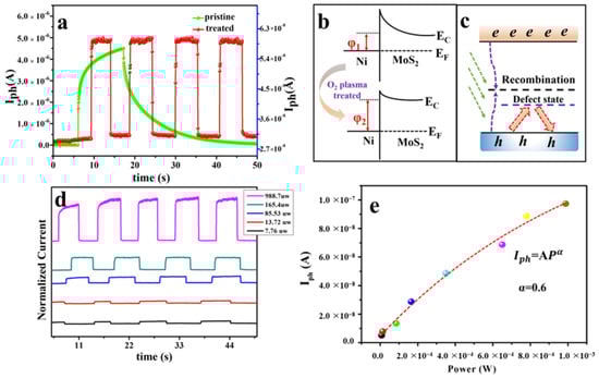 (a) Transient response of as-prepared and plasma treated MoS2. (b) Energy band diagrams of Ni/MoS2 junctions before (top) and after (bottom) O2 plasma treatment of few layer MoS2. (c) Schematic diagram of the band structure of the treated MoS2, different to pristine MoS2, the deep trap states are filled with oxygen molecules, only leaving shallow defect traps. (d) The temporal time-dependent light current (Iph) under laser illumination with a different laser power. (e) The relationship between the Iph and the laser power, and it can be fitted by Iph = APα, where α is estimated to be 0.6.
