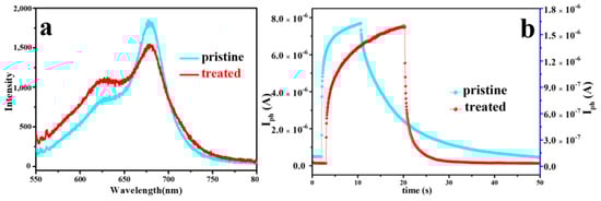 Until now, we have demonstrated that oxygen plasma treatment under suitable conditions can effectively localize the deep level defects in the intrinsic MoS2 nanosheet, thus increasing the PL intensity and accelerating the photocurrent response. To further verify the results, we changed the plasma treatment conditions (10 W, 50 Pa, 10 s) and treated another MoS2 device with the same thickness, the results are shown in Figure 4a, it can be seen that the PL intensity of MoS2 after treatment under this condition did not increase but slightly decrease, which indicated that the oxygen molecules have not bonded with the vacancies in the samples, but simply oxidized the surface samples [], and this oxidation was mainly due to the fact that more S atoms were taken away during the plasma treatment, thus increasing the probability of the presence of oxygen atoms or molecules. At the same time, we monitored the photoelectric response of this sample and found that neither the responsivity nor the response time changed significantly (shown in Figure 4b). Compared with the response speed of the previous device with greatly enhanced PL intensity, the performance of this MoS2 photodetector more intuitively demonstrates that the repair of deep-level defects traps by oxygen plasma treatment is the main reason for improving the response speed of the MoS2 photodetector. On the other hand, this further demonstrates the advantages of plasma treatment for modulating the performance of 2D materials, and different effects can be achieved by changing the treatment conditions.