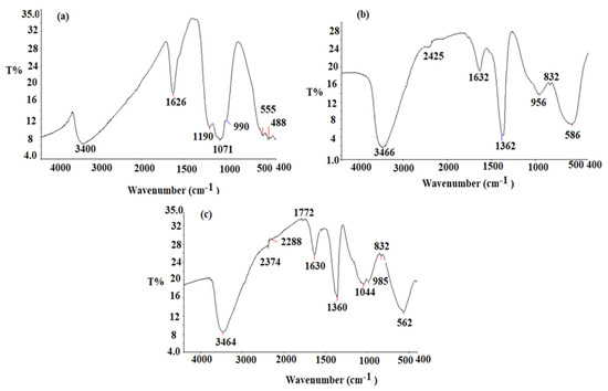 The pre-synthesized CeO2NPs, Al2O3NPs, and CeO2/Al2O3 nanocomposite FT-IR spectra were measured in the 400–4000 cm−1 region. CeO2NPs’ FT-IR spectrum (Figure 5a) revealed absorption bands at 3400 cm−1 (O-H stretching vibration), 1626 cm−1 (O-H bending vibration of absorbed water), and 488 cm−1 (Ce-O-Ce) stretching vibration and 555 cm−1 (formation of Ce-O stretching bond). The obtaining results are consistent with prior findings [53]. The FT-IR spectrum of the Al2O3NPs is described in Figure 5b.