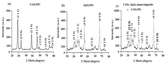 XRD patterns of (a) CeO2NPs, (b) Al2O3NPs, and (c) CeO2/Al2O3 nanocomposite measured in the range of 2θ degree between 20–80°.