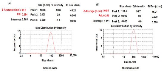 The dynamic light scattering (DLS) method was applied to measure the mean size-average diameter (d.nm) and the size distribution by the intensity of the synthesized CeO2NPs and Al2O3NPs. The particle size distribution of CeO2NPs and Al2O3NPs was measured using a particle size analyzer Zetasizer Ultra (Malvern Panalytical Ltd., Malvern, UK). As demonstrated in Figure 7a,b, the particle size distribution of CeO2NPs and Al2O3NPs was about 93.6 ± 2.4 and 104.5 ± 0.6 nm, respectively.
