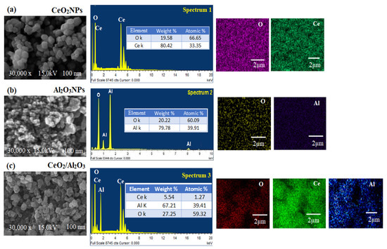 SEM, EDX and elemental mapping of (a) CeO2NPs, (b) Al2O3NPs, and (c) CeO2/Al2O3 nanocomposite.