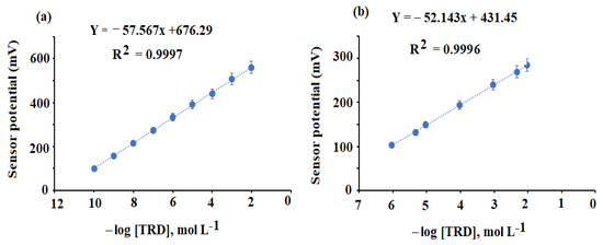 TRD interacts with PMA to form the TRD-PM complex, which is extremely stable and soluble in THF. THF was used to combine the membrane cocktail to create the conventional TRD-PM and functionalized coated wire TRD-PM-CeO2/Al2O3NPs nanocomposite sensors. The application of (o-NPOE, = 24) with a high dielectric constant increases membrane complex uniform solubility and computability with the polymeric phase of the membrane; it also improves the sensor’s selectivity coefficient by providing a mechanical property for the covered membrane [62]. The potential responses of TRD-PM and TRD-PM-CeO2/Al2O3NPs nanocomposite were described in Table 1. The achieved data indicated that the developed sensors demonstrated Nernstian behavior with slopes of EmV = (52.143 ± 0.5) log [TRD] + 431.45 and EmV = (57.567 ± 0.2) log [TRD] + 676.29 for the above-mentioned sensors, respectively, with linearity ranges of 1.0 × 10−6–1.0 × 10−2 mol L−1 (r2 = 0.9996) and 1.0 × 10−10–1.0 × 10−2 mol L−1 (r2 = 0.9997 (Figure 10a,b). The addition of CeO2/Al2O3 nanocomposite to the traditional TRD-MP sensor improved to design new functionalized system (TRD-MP-CeO2/Al2O3 nanocomposite) developed sensor’s potential response to a larger linear detection range with increased sensitivity concerning the TRD solution detection. Those data could result from the huge surface area of the additional nanoparticles that enhanced the conductivity of surface of the planned functionalized sensor. Furthermore, the high dielectric permittivity values of CeO2NPs (~23) and Al2O3NPs (~7.8–11.1) at ambient temperature may account for the better detection results achieved with the functionalized sensor [63,64].