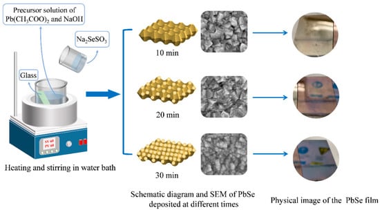 PbSe films were synthesized by the CBD method following the method reported by Hemati. et al. [31] with modifications. In order to deposit the PbSe film on a glass substrate, two precursors of Pb cations and Se anions should be prepared. The synthesis method of the Se precursor (Na2SeSO3) is reported as in the previous work [31], and the specific synthesis steps are shown in Supporting Materials. In this work, we used 2.4375 g lead (II) acetate trihydrate (Aladdin, 99.99% trace metals basis) as the Pb precursor. Additionally, sodium hydroxide (NaOH) was used as an agent to adjust the pH of the reaction solution. Rectangular microscope slides are used as substrates, which are washed with alcohol, acetone solvent, and deionized water for 15 min, respectively, and then dried with nitrogen for use. To prepare the deposition solution, first, the Pb (CH3COO)2 (2.4375g) was added into the 50 mL deionized water under stirring to dissolve and was then heated to reach 60 °C. Then, NaOH was added to control the pH of the solution reach to 10. Before adding Na2SeSO3 solution, the glass substrate was put in the beaker at a 70° angle relative to the air-solution interface. Finally, 50 mL of Na2SeSO3 was added to the beaker, and the PbSe film was deposited for 10 min, 20 min, and 30 min (named as PbSe-T10, PbSe-T20, PbSe-T30, respectively). It is worth mentioning that the reaction solution is constantly stirred during the preparation process. Figure 1 illustrates the schematic diagram of the obtained PbSe thin films on glass. The PbSe films were prepared by simple CBD at different deposition times, which obtained different micro morphology and appearance color of the films.
