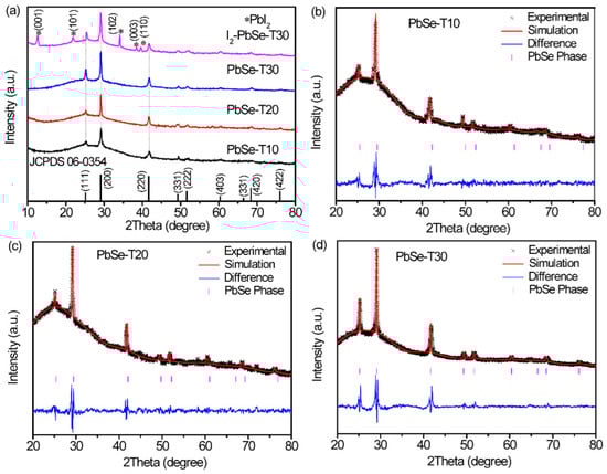 (a) XRD spectrum of the PbSe films which deposited for different times (10 min, 20 min, 30 min) and I2-PbSe-T30 films; The positions marked with * represent diffraction peaks corre-sponding to the PbI2 phase. Refinement results for PbSe: (b) PbSe-T10; (c) PbSe-T20; (d) PbSe-T30. The blue line represents the difference between the experimental and simulated results.