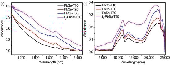 In order to investigate the optical properties of the prepared PbSe films, the near infrared to middle infrared absorption spectra were characterized. From the light absorption spectrum Figure 4a,b, it can be seen that PbSe films have broad light absorption in the range of 1000 to 25,000 nm. In addition, the sample has obvious characteristic absorption peaks at 1400, 1900 nm and in the range of 10,000 to 15,000 nm, which are consistent with the previously reported literature results [41,42]. Besides, as the deposited time increases, the absorbance value of PbSe gradually increases. Moreover, after iodization, the I2-PbSe-T30 has a higher absorbance value than the PbSe-T30, indicating that iodination can indeed increase the absorption of the PbSe.