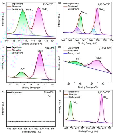 XPS spectra of the PbSe-T30 thin films and I2-PbSe-T30: (a) Pb 4f of PbSe-T30; (b) Pb 4f of I2-PbSe-T30; (c) Se 3d of PbSe-T30 (d) Se 3d of I2-PbSe-T30; (e) I 3d of PbSe-T30; (f) I 3d of I2-PbSe-T30.