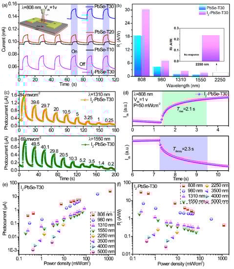 where Iph is photocurrent, Plight is incident light power density and A represents the effective photosensitive area of the device. Figure 7e exhibits the relationship between the photocurrent and different optical power densities, and the curve relationship in the figure conforms to the well-known linear law. It can be described as the overall increase in photocurrent as the power density increases, because stronger light will generate more photogenerated carriers, which results in an increase in photocurrent. In addition, Figure 7f shows the Ri corresponding to I2-PbSe-T30. It can be seen that the corresponding power density decreases and the device’s responsivity increases. When the incident power density of I2-PbSe-T30 device is 233 µW/cm2, the maximum loudness of 808 nm measured at a bias voltage of 1 V is 30.27 A/W. When the incident power density is 198 µW/cm2 and the bias voltage is 1 V, the responsivity at 1550 nm is measured to be 1.75 A/W, indicating that the device has good photodetection capabilities. In addition, the responsivity at 5000 nm is measured to be 0.053 A/W, which demonstrates its good response in the mid-infrared band.