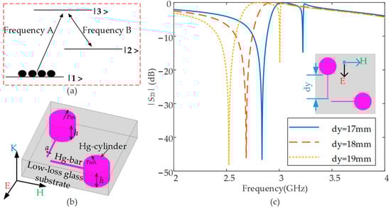 (a) Theoretical presentation of the EIT operating mechanism, (b) the 3D view of the designed Hg-EIT-like metamaterial unit with parameter definitions, and (c) transmission curves of the Hg-EIT-like metamaterial unit under different Hg bar lengths obtained by numerical simulations in the period boundary condition.