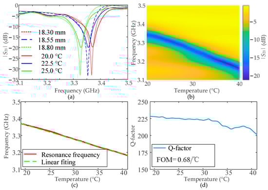 Next, the prepared Hg-EIT-like liquid metamaterial unit is placed in the center of the standard-size rectangular waveguide BJ32 (as shown in Figure 4b, the waveguide operating frequency range: 2.60–3.95 GHz), and the waveguide is connected to the vector network analyzer (Agilent 5230A). The closed rectangular waveguide used in this paper can help to concentrate the incident electromagnetic wave [47,48], resulting in smaller radiation loss and so a higher Q-factor. This will contribute to a stable and better FOM (Equation (1)) by controlling the ambient temperature to slowly increase from 20 °C to 40 °C (as shown in Figure 4c) with a temperature-changing step of 0.1 °C. The electromagnetic structure transmission coefficient curves obtained by the vector network analysis are summarized in Figure 5a,b. The extracted electromagnetic resonance frequency and the resonance Q-factor changes with increases in temperature are shown in Figure 5c,d. At the same, the corresponding numerical simulations of the same conditions are shown in Figure 5a for comparison. The figure shows that the measured |S21| curve at each temperature well matches the simulated result at the corresponding Hg bar length, especially the resonance frequency. The measured resonance strength is smaller than the simulated one, which is due to the unperfect metamaterial unit fabrication and the Hg-injection process, resulting in additional loss. Moreover, the actual glass container and rectangular waveguide used will contribute more electromagnetic loss.