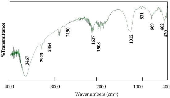 Fourier transform infrared spectroscopy was utilized to detect the interlayered anions of Si/Co LDH and determine its functional groups. Figure 2 showed the FT-IR spectra of the nanofibers of Si/Co LDHs. The clear absorption bands, which were observed at 3467 cm−1 and 1637 cm−1, confirmed the presence of both the hydroxyl groups and the interlayered water. Additionally, Figure 2 showed small bands at 2923 cm−1 and 2854 cm−1, indicating the formation of hydrogen bonds between the interlayered water and anions. These characteristic bands confirmed the formation of the LDH structure. The absorption band of the interlayered cyanate anions was observed at 2190 cm−1. Additionally, the peak at 1012 cm−1 which was due to stretching mode of C–N was confirmed the presence of cyanate anions. In addition, the presence of nitrate anions was confirmed by two bands at 1508 cm−1 and 1384 cm−1. Additionally, the vibrational mode of nitrate (υ4) was observed at 669 cm−1. Characteristic peaks for O–Si–O appeared as a broad peak at 1012 cm−1 while the band observed at 462 cm−1 is due to Si–O–Co [39], as shown in Figure 2.