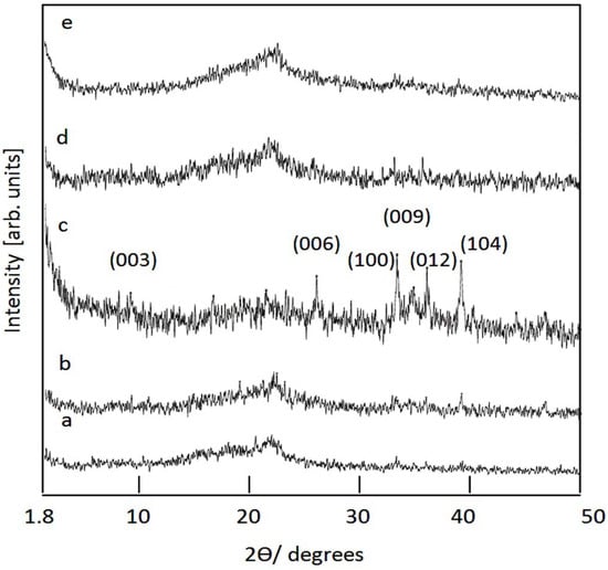 X-ray diffraction of Si/Co LDH: (a) SiCo-1-16; (b) SiCo-1-20; (c) SiCo-1-26; (d) SiCo-1-36; and (e) SiCo-2-36.