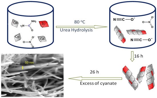 The usual geometry and morphology of Co-Al LDHs are two-dimensional layered structures with a hexagonal shape [42]. In the current structure, a one-dimensional structure was observed for Si/Co LDHs. According to the difference between the usual LDHs and the current LDHs, the mechanism of conversion from a 2D material to a 1D structure can be applied for explaining this behavior. The current Si/Co LDH creates cationic nanolayers with positive charges (+2) on silicon because of the combination between the divalent cobalt and the tetravalent silicon. In addition, the FI-IR results and thermal analyses confirmed the presence of cyanate anions (CNO−) and nitrate anions which can be used as pillars for building the LDH structure and neutralizing the positive charges (+2) of the nanolayers of Si/Co. These cyanate anions were produced through urea hydrolysis while the nitrate anions were released from the precursor of cobalt. Urea is a very weak Bronsted base (pKb = 13.8). By controlling the temperature, urea is slowly hydrolyzed and decomposed to form ammonium cyanate, converting the medium of the reaction from an acidic nature (pH = 3) to alkaline nature (pH = 8).