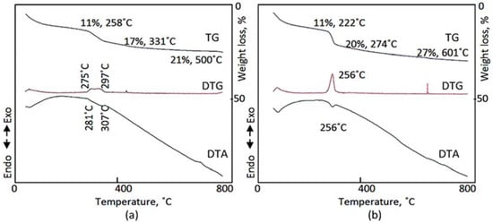 The thermal behavior of samples SiCo-1-16 and SiCo-1-36 was determined by measuring the thermal gravimetric (TGA), differential thermal gravimetric (DTG) and differential thermal analyses (DTA). Figure 5a showed that the total weight loss of SiCo-1-16 was 21% and accomplished after heating at 500 °C, while the total weight loss of SiCo-1-36 was 27% and observed at 601 °C, as shown in Figure 5b. This means that the Si/Co LDHs needed more reaction time than 16 h to be completely formed. By studying the details of thermal analyses, the TG diagrams revealed that the intercalated water and surface water were lost through two stages in a similar way for both samples SiCo-1-16 and SiCo-1-36. At 100 °C, the surface water of both samples was easily lost and was 7–8 wt%, which is consistent with the clear peak in the DTG curve.