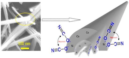 This process needs a long time to produce enough amounts of cyanate anions in addition to achieving an alkaline medium for precipitating LDHs. Therefore, SEM images showed that the better quality of nanofibers was obtained after 26 h of the reaction. The positive charges (+2), which produced from the combination between cobalt and silicon, attracted the cyanate anions and/or nitrate anions which were identified by FTIR and thermal analyses. The comparison between the structure and the size of both nitrate and cyanate anions indicated that the intercalation of cyanate anions to build LDHs is more favorable because of its straight structure. By competition with the nitrate anions, the pull of two cyanate anions (−1) toward the silicon cation (+2) is occurred through only one side as shown in Figure 6. The steric hindrance between these two anions created strong repulsion forces inside the interlayered region of LDH. These forces pushed and pressed on the nanolayers, especially on their edges leading to curling and curving for the nanolayers producing nanofibers as shown in Figure 6.