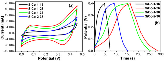 Electrochemical supercapacitor properties of the nano size one-dimensional Si/Co LDH samples explored in three-electrode system. The system based on one-dimensional Si/Co LDHs as a working electrode, platinum sheet as a counter electrode, Ag/AgCl as a compared electrode, and 2 moles of KOH electrolyte. A collection of the effective electrochemical method such as cyclic voltammetry (CV) and Galvano static charge–discharge (GCD) applied to investigate the electrochemical properties of the SiCo-1-16, SiCo-1-26, SiCo-1-36 and Si/Co-2-36 LDH electrode materials. The voltage range of the optimal capacitance of the Si/Co LDHs was measured by the CV curves under the scan rate of 5 mV/s and the optimal range was from 0.0 V to 0.45 V (Figure 7a).