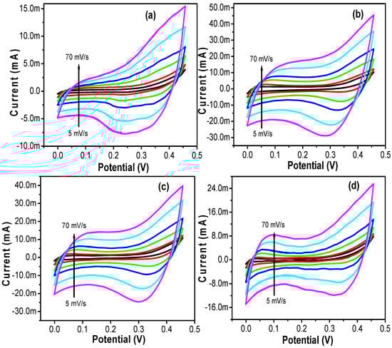 Figure 8 depicted the CV curves of all the electrode samples SiCo-1-16, SiCo-1-26, SiCo-1-36 and Si/Co-2-36 LDH, respectively, at different scan rates between 5 mV s−1 and 70 mV s−1, and within the potential range of 0.0–0.45 V verses Ag/AgCl standard electrode. CV curves of all the samples show the redox peak or redox activity on the electrode surface, which clearly indicates the pseudocapacitor behavior of the electrode material. Moreover, from the CV curves, the oxidation–reduction peaks can be observed, which move towards to the higher and lower potential due to the reinforced electric polarization and feasible kinetic irreversibility of the electrolytic ion on the electrode surface. The electrode material which displayed the redox peak in the CV analysis should not be presumed to be a pseudocapacitor, as the electrode keep altering over the whole potential window. Consequently, the electrochemical supercapacitive performance of all the Si/Co LDH electrodes were measured in terms of the specific capacity instead of specific capacitance [27].
