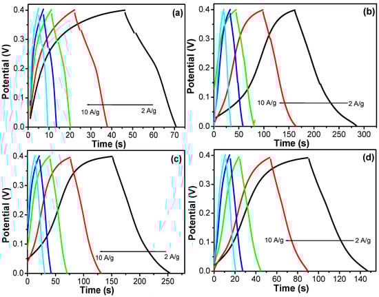 GCD curves of the (a) SiCo-1-16; (b) SiCo-1-26; (c) SiCo-1-36; and (d) SiCo-2-36 LDH electrodes at different current densities.