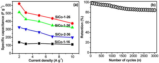 (a) Calculated specific capacitance of the SiCo-1-16, SiCo-1-26, SiCo-1-36 and Si/Co-2-36 LDH electrodes at different current densities; and (b) cyclic stability of SiCo-1-26 LDH electrodes over 3000 cycles.