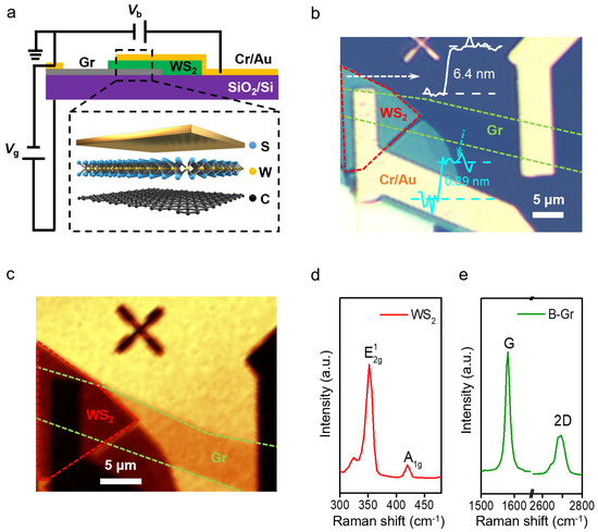 Device fabrication. Few-layer bottom graphene and a WS2 tunneling barrier layer were mechanically exfoliated from bulk graphite and WS2 single crystals from the HQ Graphene company (Groningen, The Netherlands) [30]. After exfoliation, the bottom graphene layer was transferred onto the SiO2/Si substrate, and the exfoliated WS2 layer was transferred onto a polydimethylsiloxane (PDMS) membrane. Then, the vertical graphene–WS2 Van der Waals heterostructures were carefully assembled with the dry transfer method [34] using a custom-built transfer stage. Finally, the graphene and WS2 layers were deposited with Cr/Au electrodes using standard e-beam lithography and an e-beam evaporation process. The deposited film thicknesses of Cr and Au electrodes were 5 nm and 50 nm, respectively.