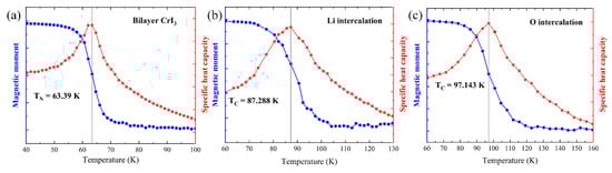 Magnetic moment and specific and specific heat capacity versus temperature in (a) pristine CrI3 bilayer, (b) Li intercalation, and (c) O intercalation by Monte Carlo simulation.