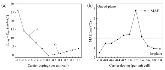 In addition, Figure 5a exhibits the energy difference of AFM and FM (EAFM − EFM) for the CrI3 bilayer as a function of the carrier doping. It illustrates that the magnetic configuration switched from the interlayer AFM (EAFM − EFM < 0) to FM (EAFM − EFM> 0) configuration when slightly increasing the carrier doping. Compared with the hole doping, the electron doping significantly changed the energy difference (EAFM − EFM). These results agreed well with that of the Li-intercalation and O-intercalation configurations. The MAE of the CrI3 bilayer with different carrier doping is shown in Figure 5b. , where and are the energies of CrI3 bilayer in in-plane [100] and out-of-plane [001] magnetization direction, and n is the number of Cr atoms. The positive and negative values of MAE denote that the easy magnetization axis is perpendicular and parallel to the plane of the CrI3 bilayer, respectively. Clearly, the MAE can be effectively tuned by the charge doping. The system has a magnetic phase transition from the out-of-plane to the in-plane as y-axis after exceeding certain electron doping (∼0.2 per unit cell) and hole doping (~0.4 per unit cell). It should be noted that there was almost no difference in energy with respect to the different in-plane directions from our DFT calculations.