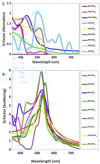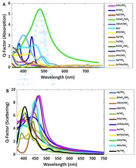 Among the calculated materials, the selected nanoparticles are listed in Table 1; some of them have potentially applicable for synthesis and use in the fabrication of transparent displays. The absorption and scattering of the listed materials are shown in Figure 2.