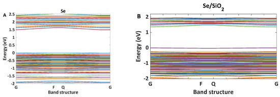 Calculated bandstructure for Se, Se/SiO2, and Se/Ethanolamine nanoparticles, (A) Se, (B) Se/SiO2, and (C) Se/Ethanolamine nanoparticles. Comparison between Se and Se/SiO2 indicates some distances between energy levels in the conduction band and valence band however, the bandgap has not changed. In the case of Se/ Ethanolamine bandgap of the Se has increased.