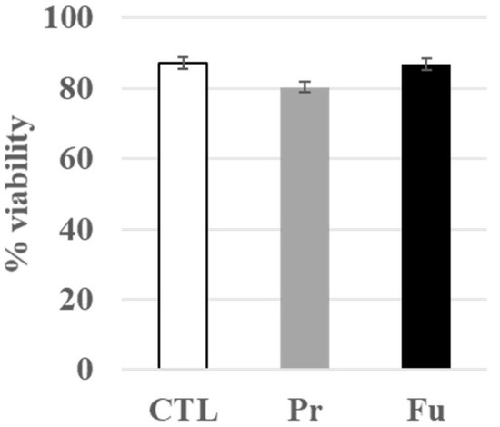 Viability of J774A.1 cells after a 10-day exposure to silica (2 µg/mL/day). CTL: control, cells without nanomaterials, Pr: precipitated silica 220 m2/g, Fu: fumed silica 200 m2/g.