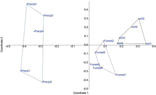 The results, shown in Figure 2, indicated that precipitated silica had an overall greater effect on macrophages than fumed silica. The first two axes accounted for 35 and 10% of the variance, respectively.