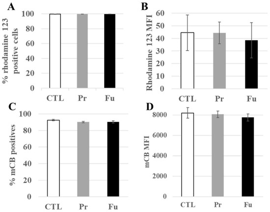 Mitochondrial transmembrane potential and redox potential of J774A.1 cells after a 10-day exposure to silica. (A) Proportion of rhodamine 123 positive cells, (B) MFI of rhodamine 123 positive cells, (C) Proportion of positive cells to monochlorobimane (mCB), (D) MFI of mCB+ cells. CTL: control, cells without nanomaterials, Pr: precipitated silica 220 m2/g, Fu: fumed silica 200 m2/g.