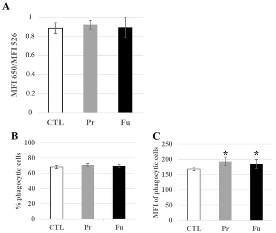 Lysosomal and phagocytic activity of J774A.1 cells after a 10-days exposure to silica. (A) Lysosomal ratio using acridine orange (entire/altered lysosomes), (B) Proportion of phagocytic cells, (C) Activity of phagocytic cells, MFI: mean fluorescent intensity. CTL: control, cells without nanomaterials, Pr: precipitated silica 220 m2/g, Fu: fumed silica 200 m2/g. Statistical significance in a Student t-test: * p < 0.05.