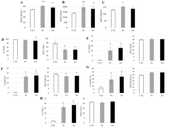 Expression of surface markers of J774A.1 cells after a 10-days exposure to silica. (A) CD11b marker (monocyte-macrophage, integrin α), (B) CD18 marker (integrin β), (C) CD204 marker (scavenger receptor), (D) CD86 marker (B7 family), (E) CD38 marker (inflammation, induced by IFNγ and LPS), (F) MHC class II (inflammation, signalization with CD4 T lymphocytes), (G) MARCO marker (scavenger receptor), (H) CD14 marker (LPS receptor), (A–C) All the conditions expressed these markers; only the amount of marker detected at the cell surface is different for cells exposed to SiO2. CTL: control, cells without nanomaterials, Pr: precipitated silica 220 m2/g, Fu: fumed silica 200 m2/g. Statistical significance in a Student t-test: * p < 0.05; ** p < 0.01.